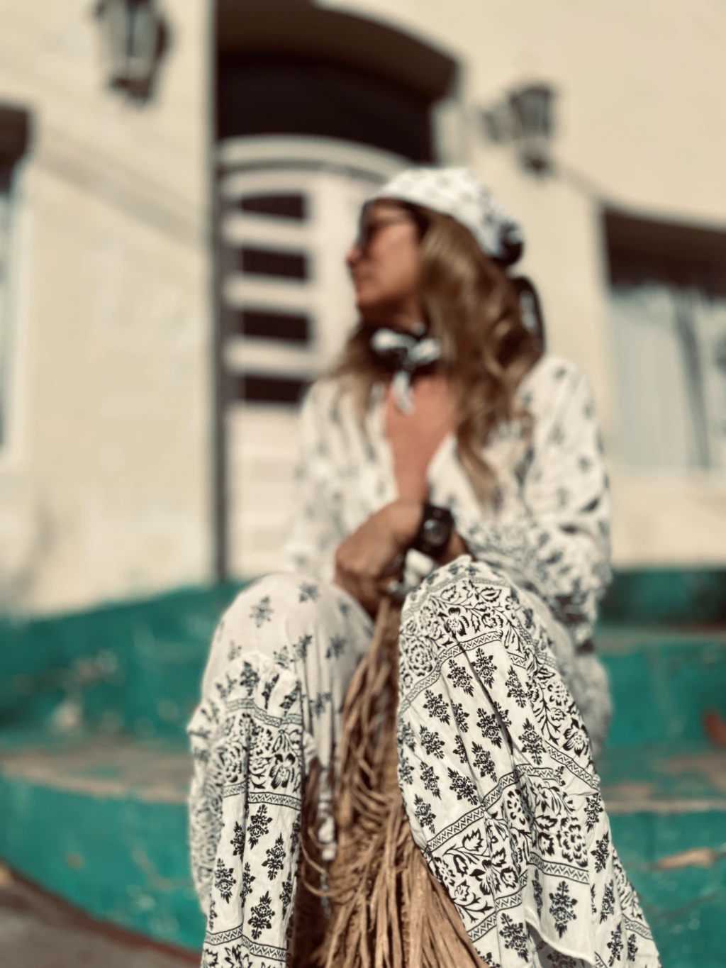 La blusa, de mangas largas con volados, se ata a medida, permitiendo un ajuste personalizado que se adapta a cada cuerpo.