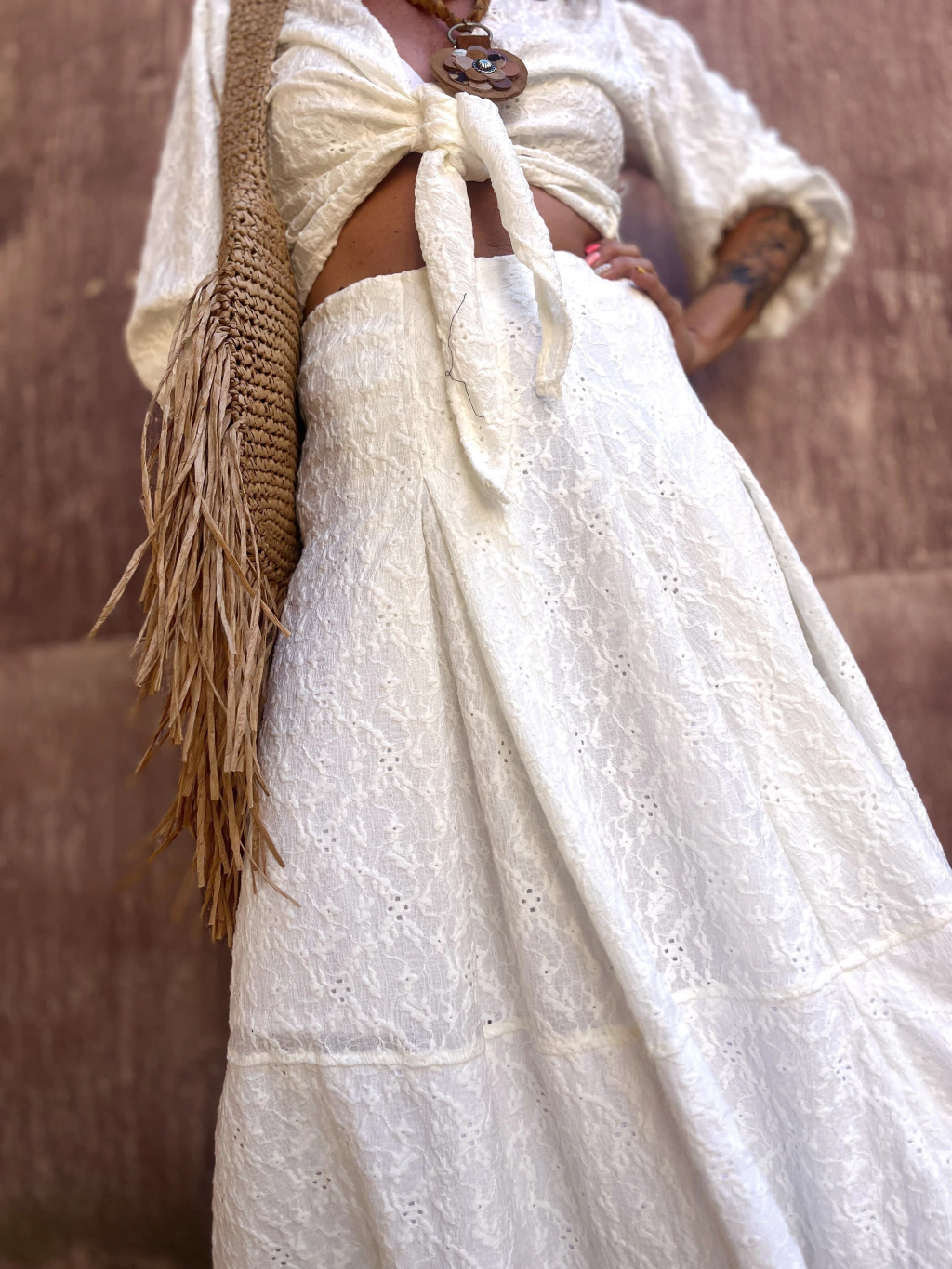 Esta falda de broderie cuenta con un forro interno que asegura confort y un acabado impecable.